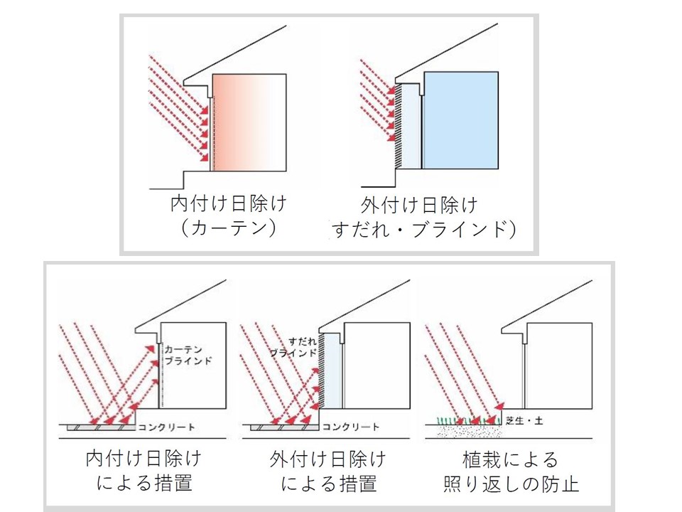 夏の日射しは冷房の大敵だ。しっかり遮る必要がある。この場合、カーテンなどで室内側から遮るより、すだれや外付けブラインドなどで外側から遮る方が効果は大きい。また、窓から直接入る日射しだけでなく、窓の前の地面からの照り返しで入ってくる熱も防ぎたい。その方法としては、植栽を施しておくことなどが効果的だ。