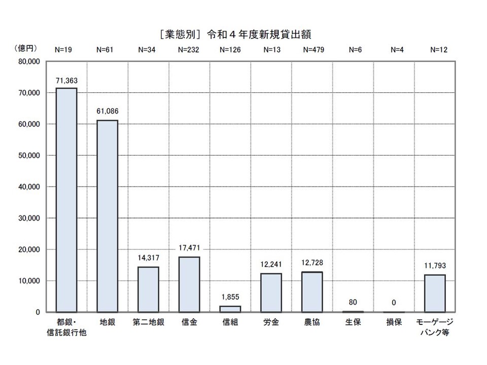 2022年度の新規貸出額は20兆2,934億円で、2021年度から5,014億円減少しているものの、ここ数年ほぼ横ばい状態だ。業態別の新規貸出額を見ると、都市銀行・信託銀行(7兆1,363億円)と地方銀行(6兆1,086億円)が圧倒的に多く、3位の信用金庫(1兆7,471億円)を大きく引き離している。