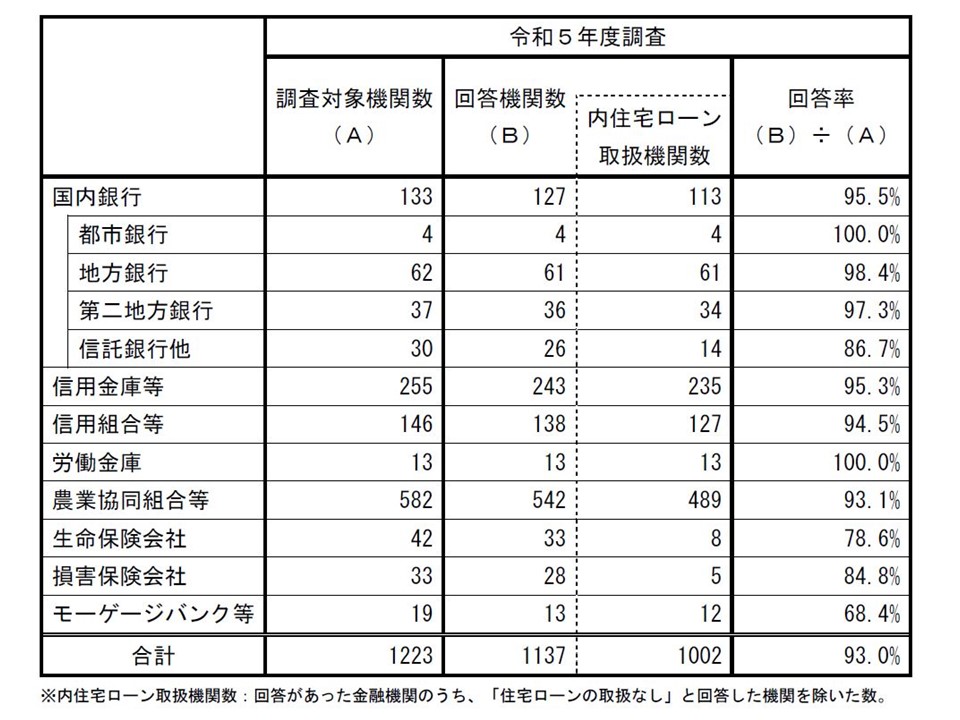 同報告書は都市銀行、地方銀行、農業協同組合等の住宅ローンを供給している民間金融機関を対象に実施した調査結果だ。調査期間は2023年10月~11月。調査対象機関数は1,223となっている。今回は「新規貸出額」「新規貸出額の使途別割合」「新規貸出額における金利タイプ別割合」「新規貸出額における固定金利期間選択型の固定金利期間別割合」「スコアリング方式審査」「審査項目」について紹介したいと思う。