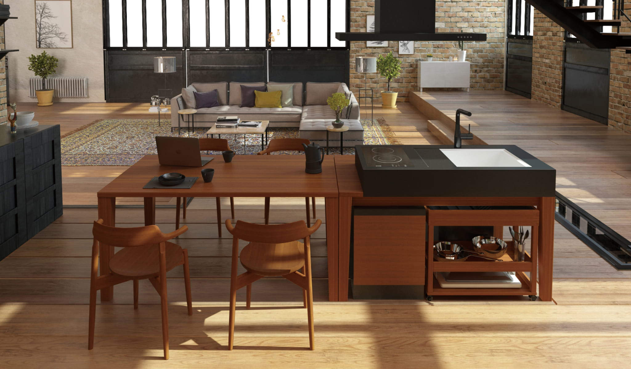 その他、フレキシブル、モビリティといったことも考えられるのではないか、と小泉さんは話す。「キッチンの要素をコンパクトにしたという商品(HIROMA)は、テーブル部分の置き方が自由になるため、部屋の使い方に合わせたり、模様替えもしやすい。他にも流しのユニットとIHのユニットを分離して持ち運びできる商品(モビリティキッチン)なども研究・発表しています」とか。