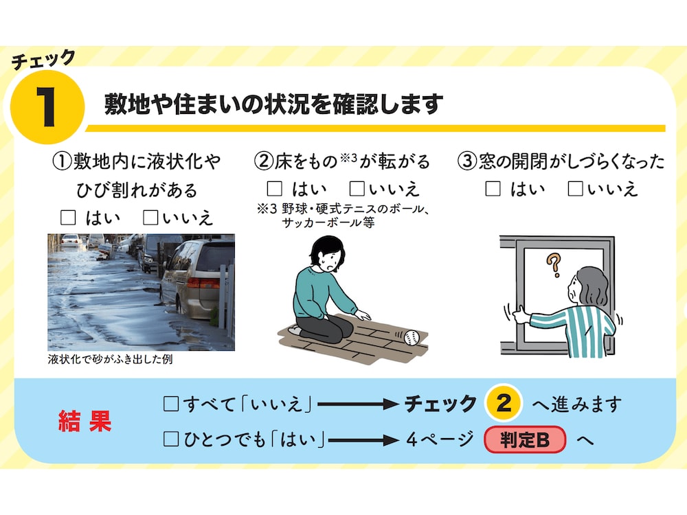 このような家屋に居住していると、再度地震が発生したときに倒壊などの大きな被害を受けることが考えられ、危険である。とはいえ、建築などの知識のない人が安全かどうかを調査・判断するのは困難な作業といえよう。そこで国土交通省と一般財団法人日本建築防災協会は木造住宅向けに、専門の知識がなくても住宅の状況を判断できるチェックリストを考案し、パンフレットを作成し配布している。