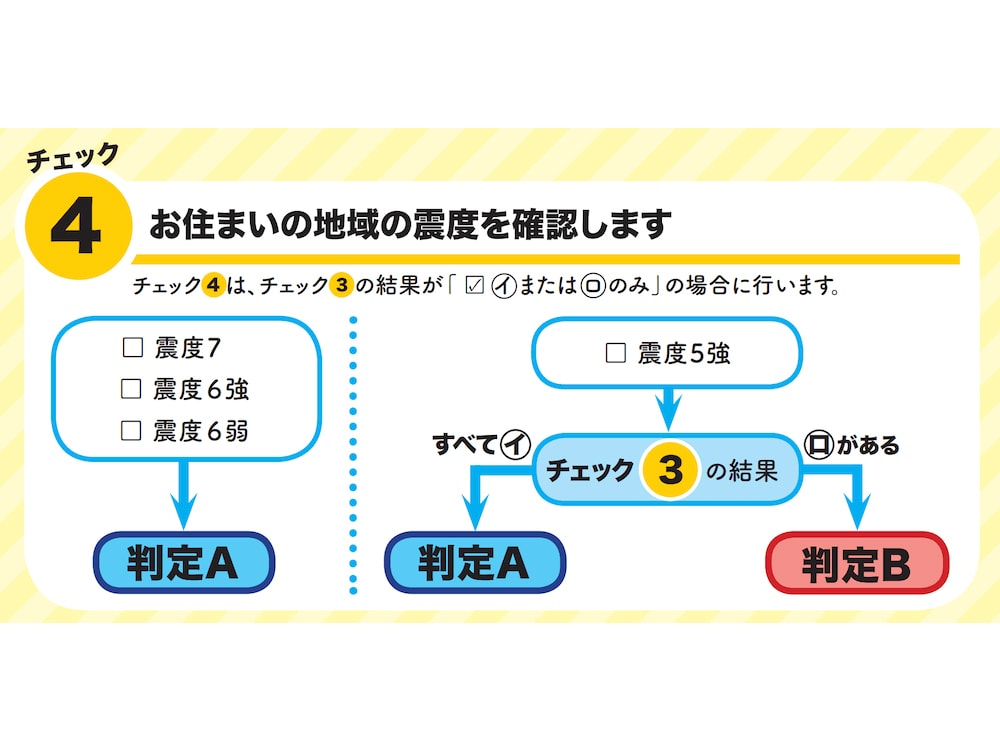 一方、「震度5強」だった場合、チェック3の内壁・外壁の状況がすべて「(イ)目立つ損傷がない」だったら、住み続けても大丈夫と判断できる。しかし内壁・外壁のうち、ひとつでも「(ロ)損傷が比較的小さい」があった場合は、居住する地方自治体の役所や専門家への相談が必要になる。
