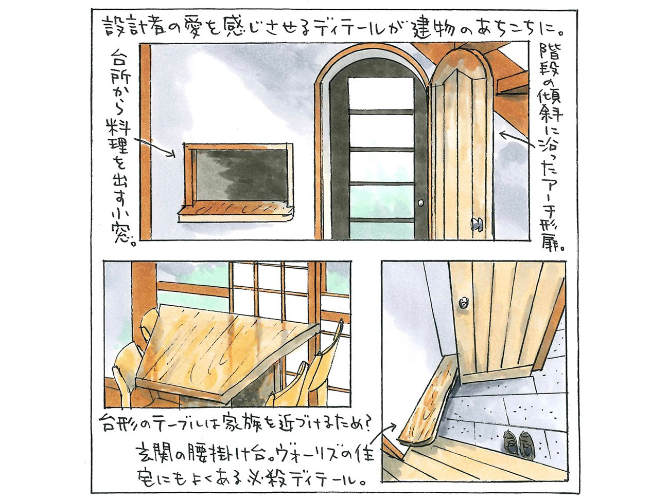 台形のダイニングテーブルやキッチンに入るアーチ扉のかわいらしさ、ダイニングに食事を出すための小窓のアイデア、寝室窓側の長机…など、妻のリクエストでつくったとしか思えない。