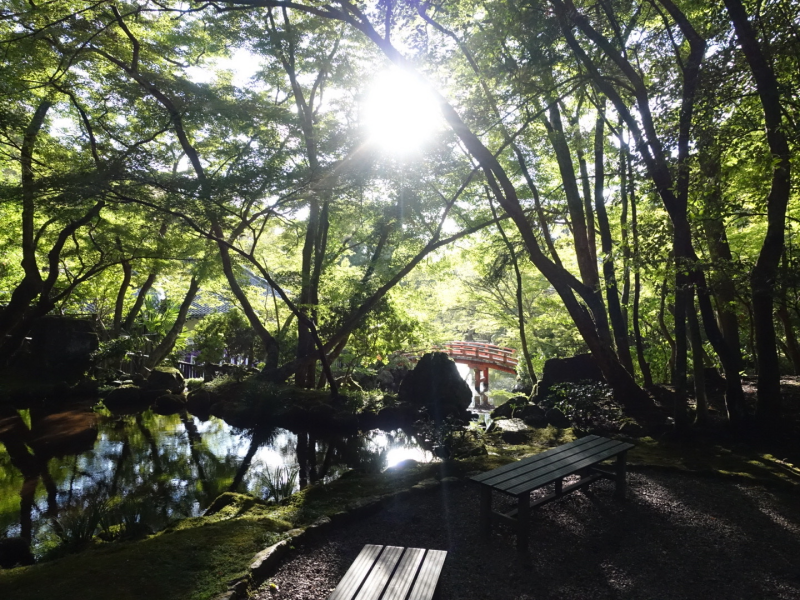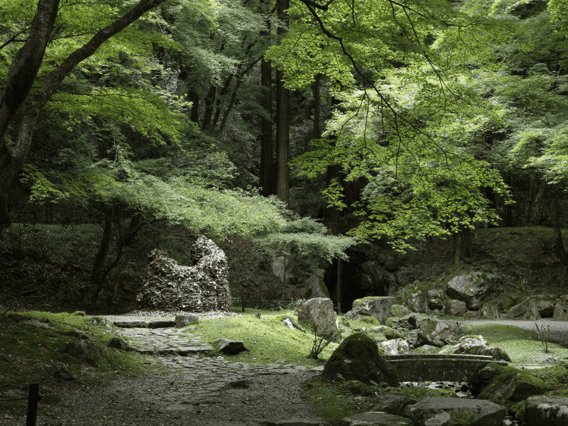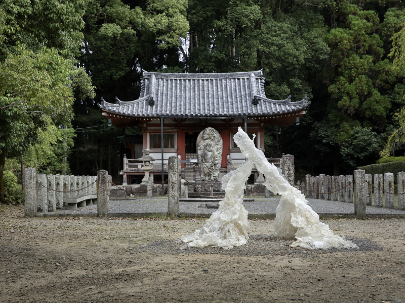 和紙と木で組んだ同じ形の四角形のパーツを組み合わせ、包み込まれるような形状をしたフォリー。「母なる仏」といわれる准胝(じゅんてい)観音のようなやさしく包み込んでくれる感覚を、フォリーを通じて体験することができる。三角形にしたほうがいいとアドバイスを受けたが、四角形にするためにパーツや全体のバランス設計をこだわり、最終的に四角形で実現した。和紙の白さが景色の中で映えていて、太陽の光や木陰もうまく利用した作品だった。