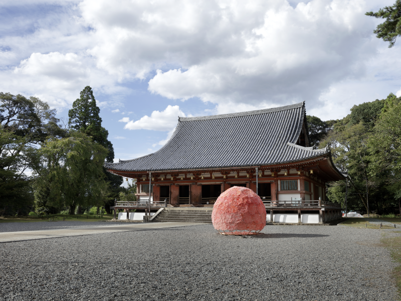 優秀賞となったのは、7班の「泡沫」。朱色に染められた羊毛に囲まれる大きな球形のフォリーだ。金堂前に建てられ、包み込まれるような球体で命の原点「胎内」をイメージしている。密教の曼荼羅の「胎蔵界」を表していて、中から見た円形の竹のフレームが曼荼羅を思い起こさせるような形をしていた。斬新だったのが、このフォリーは回転する設計になっていたことだ。中に入ると窓から醍醐寺のさまざまな風景が切り取られて見られるようになっている。羊毛は糞や草のついている状態だったものを、1kg当たり6時間かけて8kgもの羊毛を洗い上げ、乾かし、着色したというが、ファッションの専門家の視点でこの作業を成し遂げたことに対して高く評価されていた。また、合宿に入った後のスムーズな制作進行から、事前の準備の徹底ぶりに対しても好評を得ていた。
