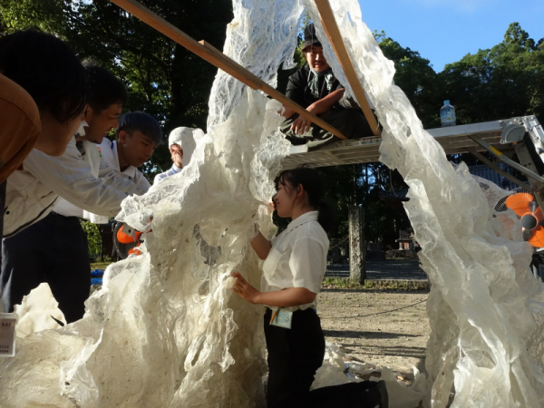 こだわったポイントは、でんぷんのりを素材として使用したことだ。でんぷんのりは、古くから寺と、まちの人々をつなげる役割を担っていたという。不動明王と「空(くう)」をつなげるという意味を考えて素材を選んだ。強度、透明度のバランスを考え、でんぷんのりの調合を考えるところから制作がなされた。でんぷんのりを予定していた大きな一枚のパーツにすることができず、合宿当初は立たせることができるか不安だったそうだが、諦めずに大小さまざまなパーツを組み合わせることで作品を完成させることができたという。審査では、新たな素材作りから始めるという発想力の高さが多くの講評者から好評を得る結果となった。