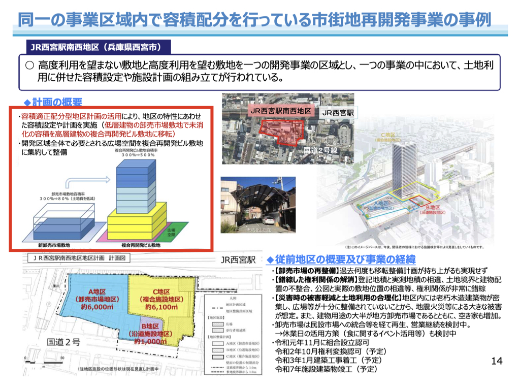 同市では、低層建物の卸売市場敷地で未消化の容積を高層建物の複合再開発ビル(35階建て、高さ約130m)敷地に移転している(指定容積率が300%の地域で、卸売市場では容積率を80%にして土地原価を低減し、複合再開発ビルでは300%から500%に上限を引き上げし、通常よりも保留床を多く確保)。