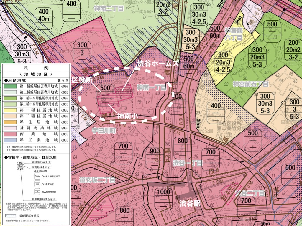 渋谷駅北西側に位置する「渋谷区立神南小学校」と築50年となる「渋谷ホームズ」の都市計画の指定状況を確認してみる。この周辺の用途地域は「商業地域」で指定容積率は500%となる。