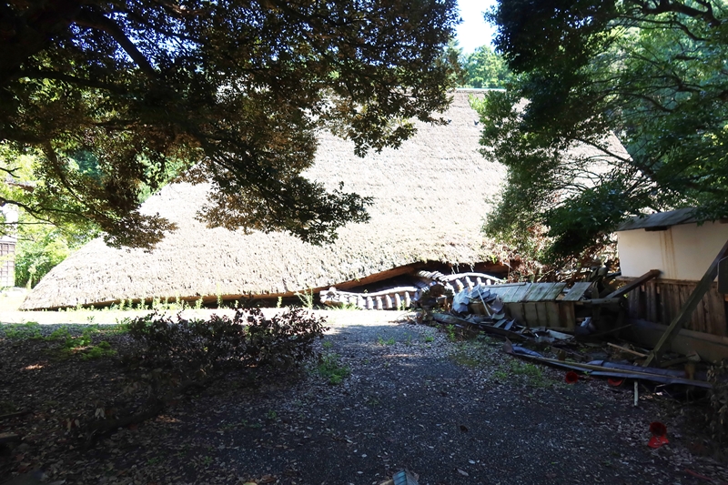 民間の住宅ながら2023年までは公開されていたが、コロナ禍で維持管理費の捻出が難しいと公開を終了。その後ほどなくして被災。建物が潰れて大きな屋根がその上に乗るような状態になってしまった。その後の豪雨で周囲には土砂が流れ込むなどして茅葺屋根の劣化が心配されているそうだが、再建費用は多額に上るとされており、今のところ、再建の道は見えていない。