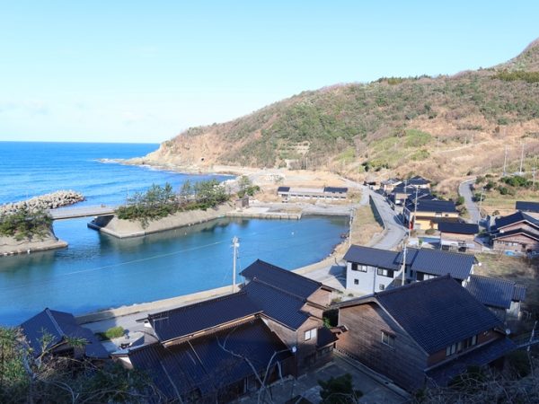真浦町は能登半島の突端にある珠洲市の日本海側、輪島市に隣接したまちで、現代集落のフィールドとなっている集落は能登半島の海岸部をぐるりと走る国道249号の旧道沿いにある。人家はごくごく小さな入り江に沿った旧道沿いのわずかな平地に並び、そこから少し上がった山裾にも住宅が点在する。
