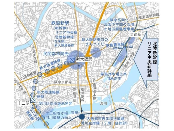 大阪府と大阪市は、「新大阪駅周辺地域都市再生緊急整備地域 まちづくり方針の骨格」(2020年3月)を基に、2022年6月に「新大阪駅周辺地域都市再生緊急整備地域まちづくり方針2022」をとりまとめた。これは、リニア中央新幹線の全線開業などで、今以上に広域交通の拠点となる新大阪駅とその周辺地域の「20年から30年先を見据えた新しいまちづくりを官民が共有して進めていくため」(大阪府ホームページ)のもの。この方針の中で、十三エリアは新大阪に近い「周辺地域」として、広域からの回遊を図る拠点として整備されることが検討されている。