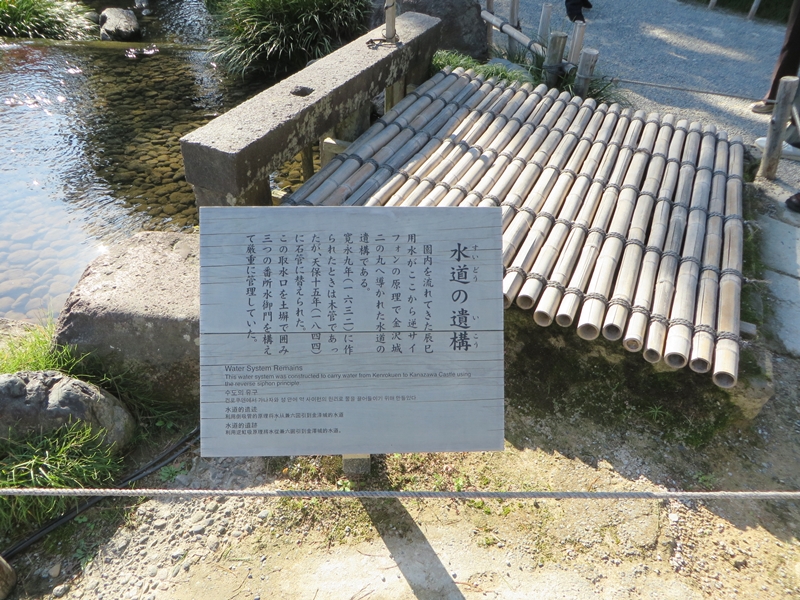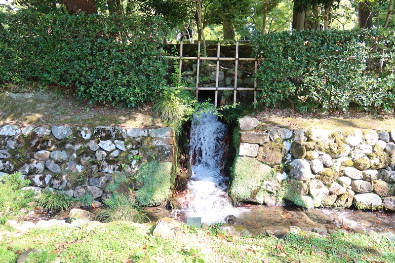 取水口は犀川上流にあり、そこから4キロに及ぶ暗渠なども経て兼六園に至るまでの総延長は約11キロ。高低差、水位差を上手にクリアして運ばれてきた水は兼六園の曲水を満たした後、落水してさらに市内を分流しながら流れる。だが、わざわざ用水を探さなくても兼六園に行けば400年(!)近く前に作られた用水が見られる。