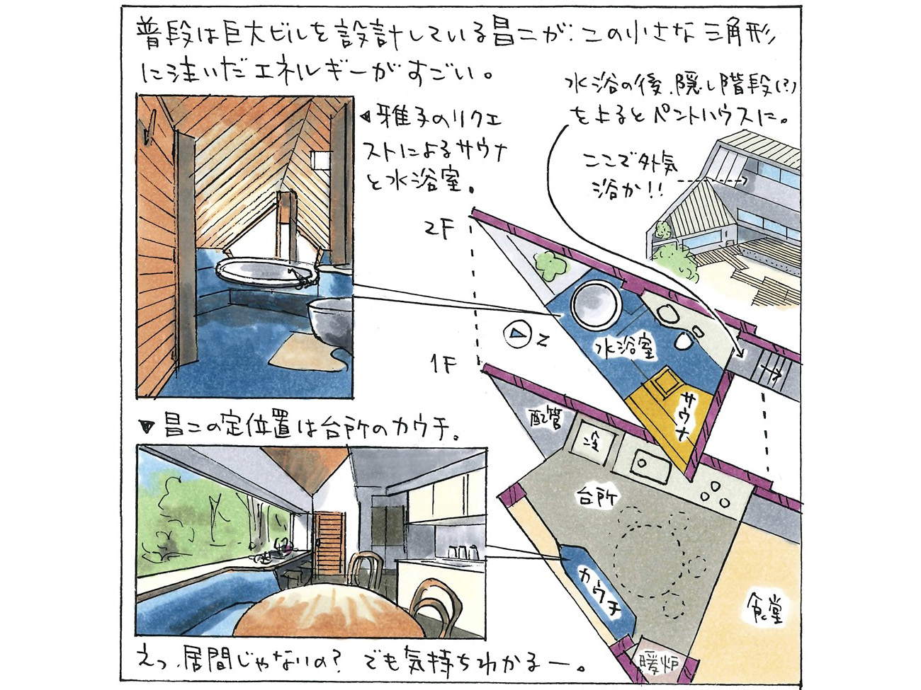 三角部分の2階に上ると、風呂好きだった雅子のリクエストでつくったサウナと水浴室がある。
