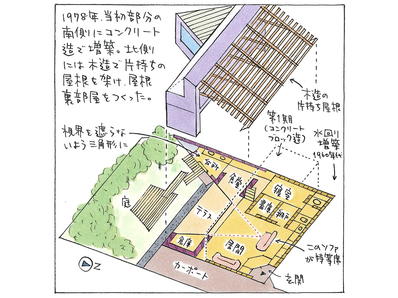 当初は第1期の上に直接乗せようと考えたが、建築基準法の改正があって、法的にできなくなったのだという。普通は建て替えるところだが、昌二は鉄筋コンクリートで南側に2層の躯体を立ち上げて、北側に木造で片持ちの屋根を架けるようにして2階部分をつくった。