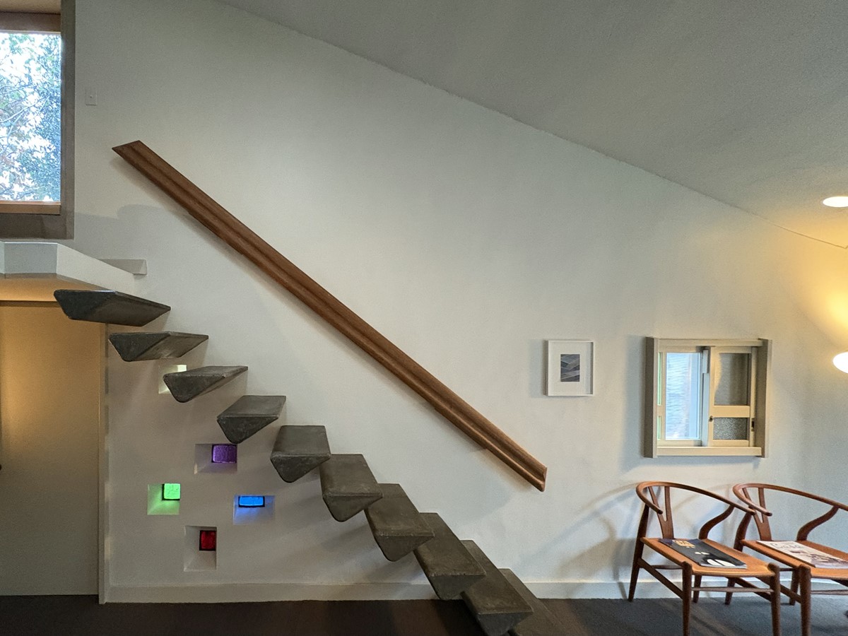 斜めに傾斜する天井に設けられた複数の丸い穴(トップライトや照明)。壁から突き出た片持ちの階段。階段下にある色ガラスをはめ込んだ小さな開口部。書斎の窓の彫刻的な日よけ……。などなど、かつてモノクロ写真で見たものが、想像を超える鮮やかさと強い陰影で目に飛び込んでくる。