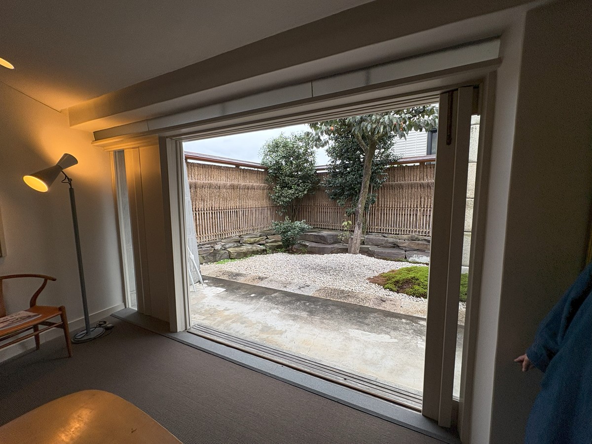 一番予期していなかったのは、敷地奥(西側)に、道路側よりも広い庭があり、それに面して大きなガラス引き戸があること。建物の平面は道路側より奥側の方が広い。建物の裏側に開く家だったのだ。
