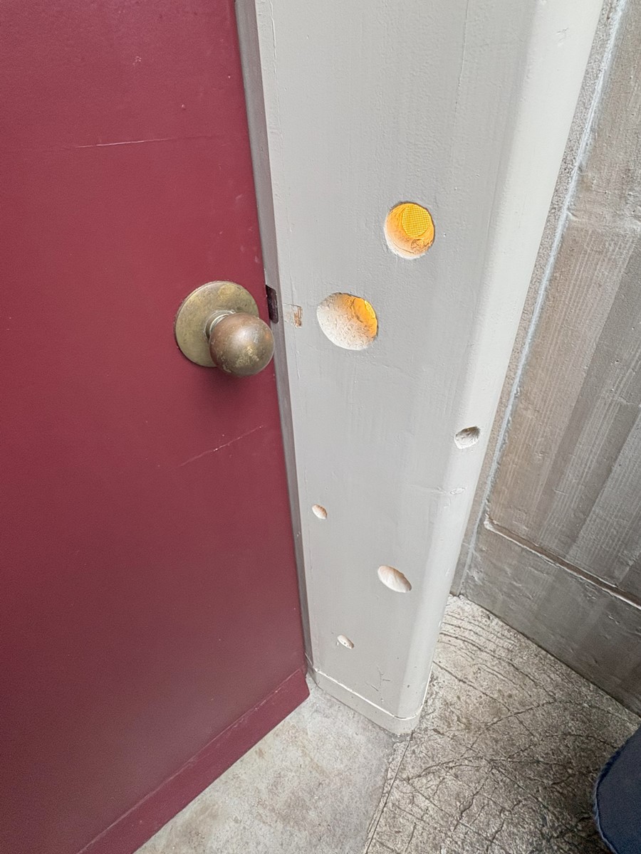 夫人は小柄な人だったのだろう。玄関からキッチンに向かう通り道がこんな人型になっていた。背の高い男性だと頭が当たる。夫人の聖域を示す遊び心だろうか。
