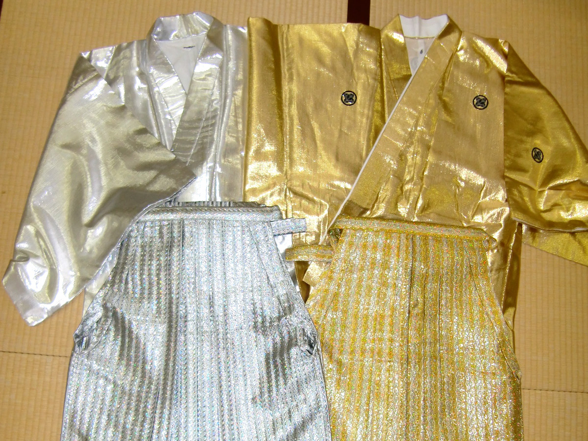 全身金色や銀色の着物、キラキラと光るスパンコール、鮮やかな色彩のデザイン。