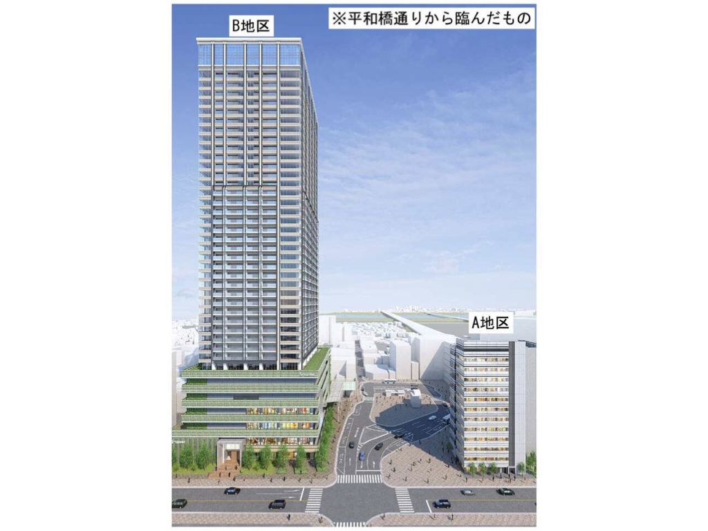 現況では北側に位置する交通広場と一体的な空間となることから、現在の交通広場がより広くなることになる。このエリアに、地下2階、地上39階、高さ約160mの複合型タワーマンションが整備される。計画住戸数は543戸、駐車場約210台、駐輪場約1,550台、この他に低層階は店舗や事務所が入る予定となっている。また、1階部分は駅前広場、平和橋通り、ルミエール商店街に面する予定となっている。