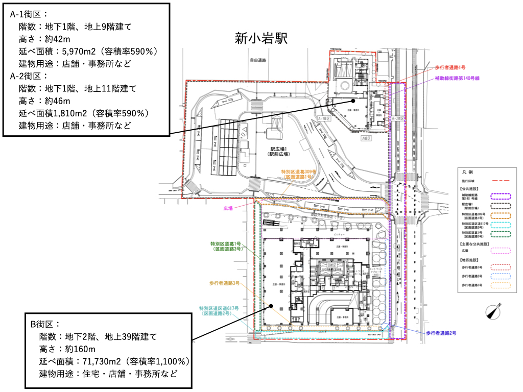 葛飾区では、「葛飾区都市計画マスタープラン(2023年12月)」において新小岩駅周辺を広域複合拠点として位置付けており、「多様な世代に対応した魅力的な広域拠点の形成。震災や水害など様々な災害に強い街づくり。川を生かした身近な水辺空間の充実と緑豊かな市街地の形成。」を目指すこととしている。なお、都市計画マスタープランとは、市区町村の都市計画の基本的な方針とされるもので、将来の土地利用のあり方を定める計画として重要な位置付けにある。