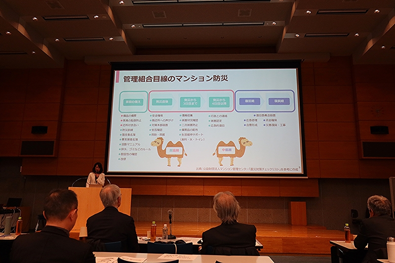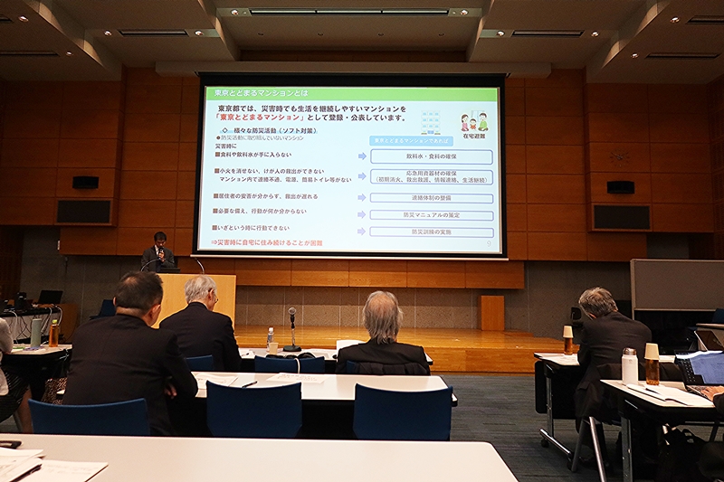 続くお二人の講演はマンションの災害対応力を異なる視点から評価しようというもの。最初の東京都住宅政策本部民間住宅部マンション課の山口大助さんは2012(平成24)年に創設された東京とどまるマンションを説明した。これは耐震性、ハード対策、ソフト対策でいくつかの要件を満たしたマンションを登録できるというもので、2024年11月末時点で508件の登録がある。
