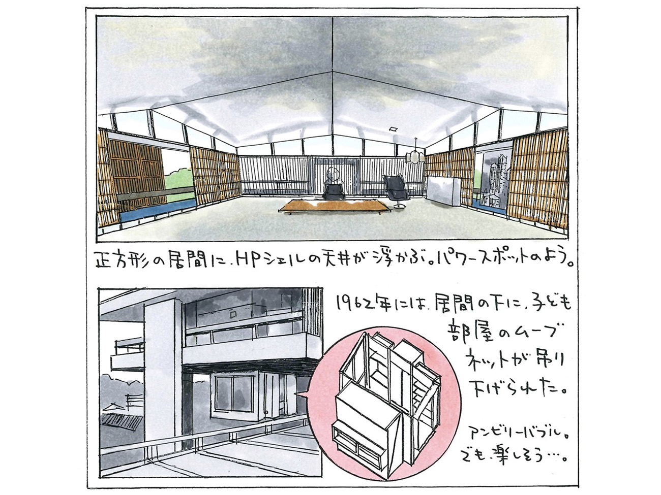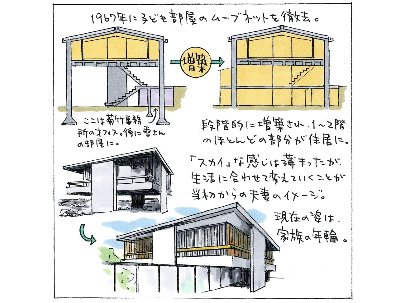 「夫人がなんだかかわいそう」と筆者が思ったのは、当初の家に夫人が1人になる場所がないからだ。だが、考えてみると、菊竹の書斎もない。夫婦が対等だ。設計したのは雪さんが生まれる前。その時点では、2人だけで気兼ねなく暮らせる大きなワンルームの家だったのだ。