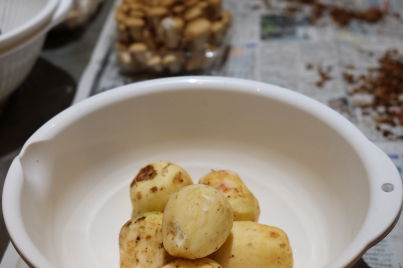 こんにゃくはフォークなどを突き刺した後に手でちぎるのだが、これなら子どもでもできる。しめじをバラバラにするのも同様。料理の経験がなくても誰にでもできる。少し大きな子どもであれば里芋の皮剥きもできるはずだ。