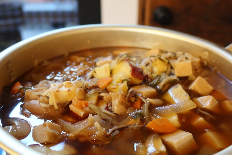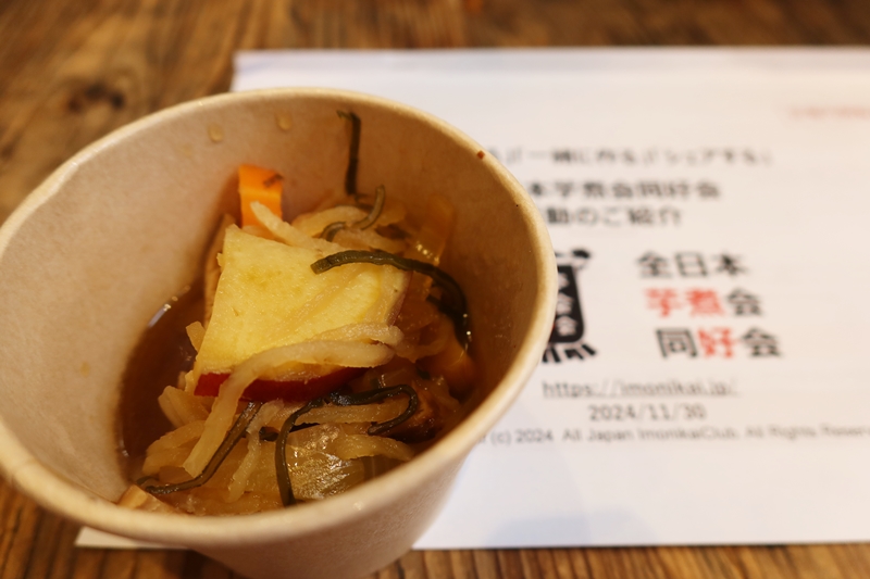 そしてもうひとつがぼうさい芋煮(備蓄品バージョン)。災害時でも温かく、栄養豊富で水分が補給でき、被災者が心の安らぎを得られるスープとして作られた。里芋の代わりにさつまいも、肉類の代わりに凍み豆腐、麩、切り干し大根を入れており、ベジタリアンにも対応できる。