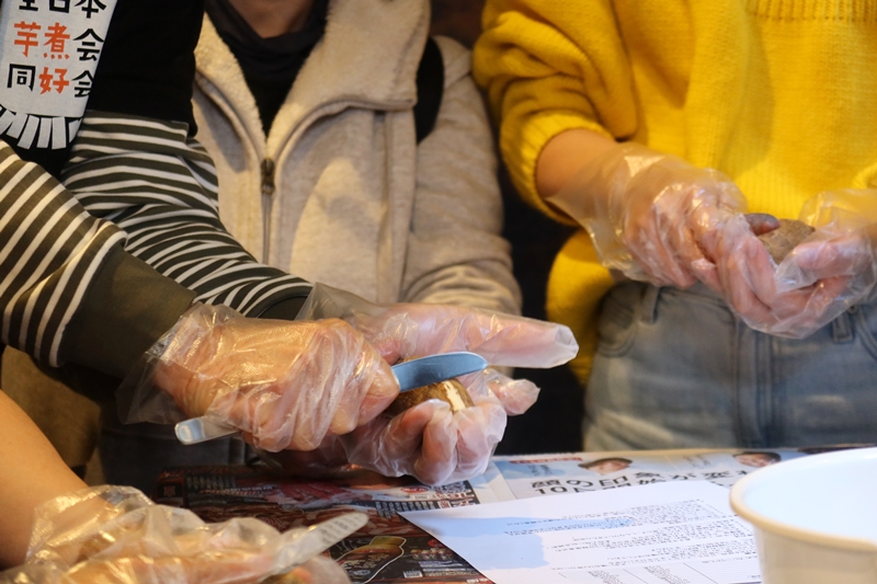 食べるだけではなく、実際に芋煮を作る体験会もあった。事前に申し込んだ人たちが里芋の皮を剥く、こんにゃくをちぎる、しめじをバラバラにするという3つの工程を体験するのだが、見学しているだけでも発見が多かった。