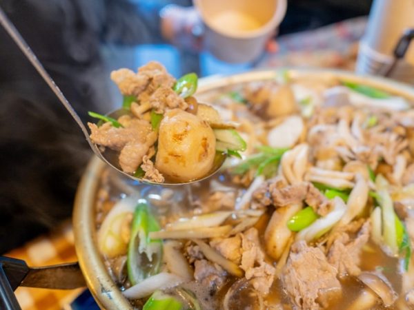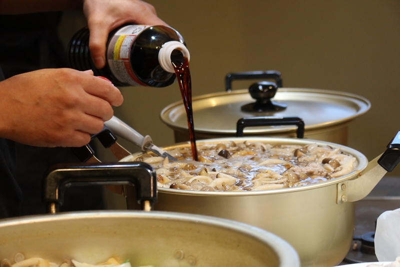 その日用意された芋煮は4種類。山形村山風は醤油味で、里芋、牛肉、こんにゃく、長ネギを中心に地域によってごぼうやキノコ類が入るもの。この日はしめじが入っていた。〆には残りのスープを使ったカレーうどんが人気とのこと。