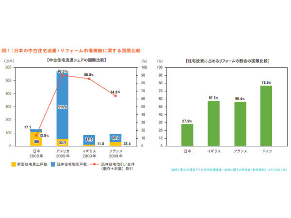 この頃、国は日本の全住宅流通量に占める既存住宅の割合を約13.5%(2008年、住宅・土地統計調査および住宅着工統計に基づく国土交通省の資料より)、住宅投資に占めるリフォームの割合を27.9%(2011年)と示し、それぞれ欧米諸国と比較して小さいとしていた(図1)。このような状況を踏まえ、2011年度の住生活基本計画からは、指標に「リフォーム市場の整備」が加えられ、瑕疵担保責任に加入した住宅の全リフォーム実施戸数・棟数に占める割合が数値目標として設定された。また、取引時やリフォーム時における建物検査(インスペクション)と一体となった瑕疵担保責任保険の活用や住宅履歴情報の蓄積を促進するなど、消費者の既存住宅に対する不安解消を図ることで、循環型市場の形成に向けて環境整備を行うことも示された。