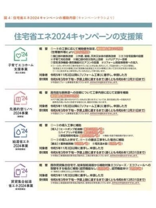 また、先進的窓リノベ事業の予算消化率も90%に上り、その申請住戸数は24万戸となったほか、給湯省エネ事業は予算消化率こそ29%だったものの9万戸が補助を受けた。このように、過去最大級の補助金制度も後押しして、住宅の省エネ化ニーズは高まっているものと推察される。2024年も「住宅省エネ2024キャンペーン」としてさらに内容を拡充して実施されている。