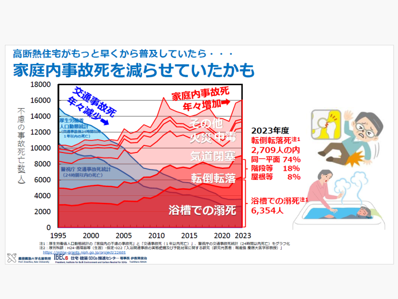 心筋梗塞や脳卒中、肺炎などの病気は、家の中の寒さによっても引き起こされるという。また、家庭内事故死も増え続けており、浴槽の溺死数は、交通事故の2倍にもなっているのだそう。こうしたリスクを低減できるという意味でも、断熱対策は重要である。