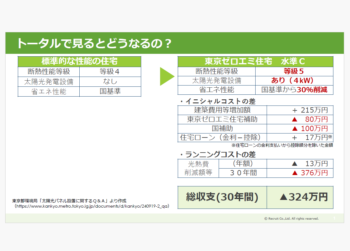 例えば、断熱性能等級4・太陽光発電なし・省エネ性能は国基準の住宅と、東京ゼロエミ住宅水準Cである、断熱性能等級5・4kWの太陽光発電設置・省エネ性能は国基準の30%減の住宅を比較すると、30年間で324万円の節約になるという試算が出された。