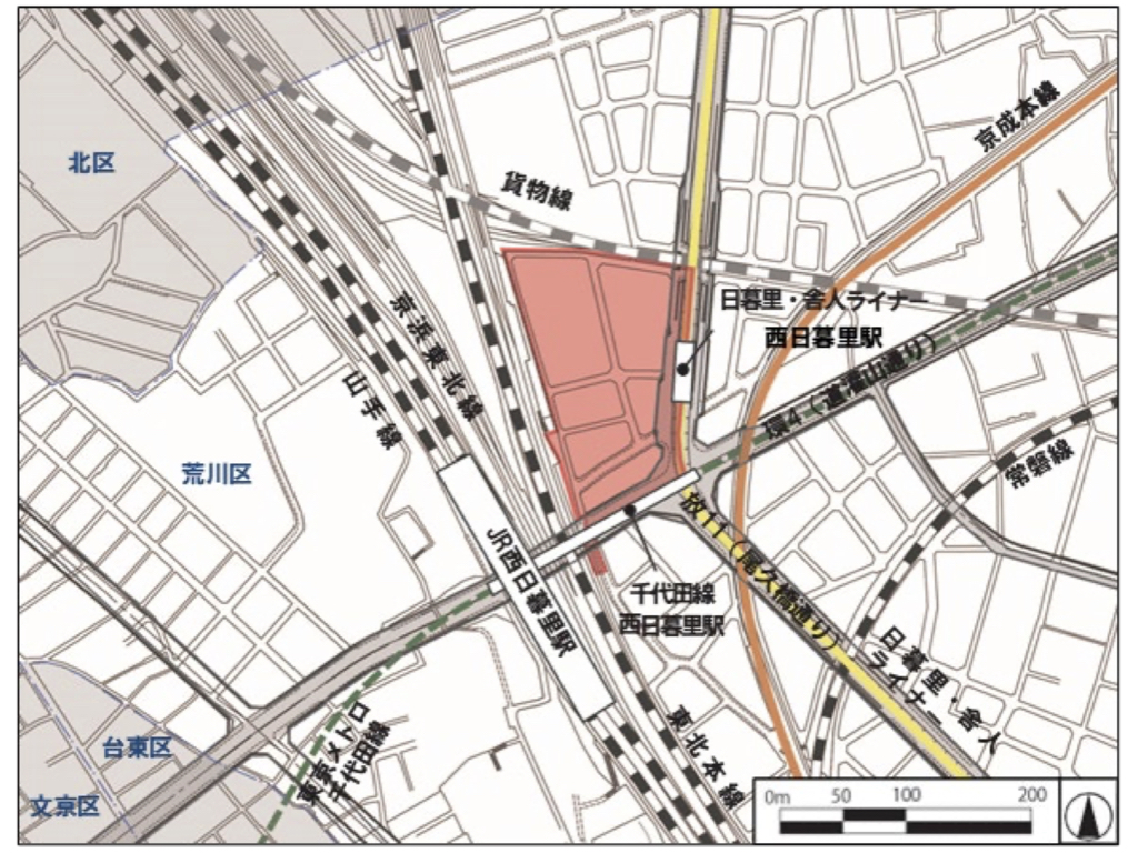 また、西日暮里駅周辺は、荒川区の都市計画の基本的な方針を定めている「荒川区都市計画マスタープラン(2009年3月)」において、広域拠点として位置付けられており、4線が乗り入れる交通結節機能を生かしたにぎわいのある街づくりとして“再開発による駅周辺の計画的な土地利用”を推進することとしている。