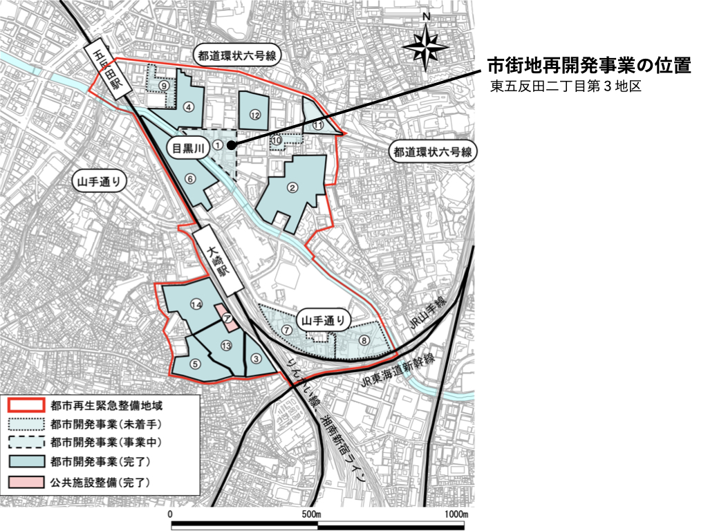 大崎駅・五反田駅周辺では、2002年7月に約61ヘクタールの駅周辺地区が「都市再生緊急整備地域」に指定され、現在に至るまでに14の再開発プロジェクトが完了・進行している。