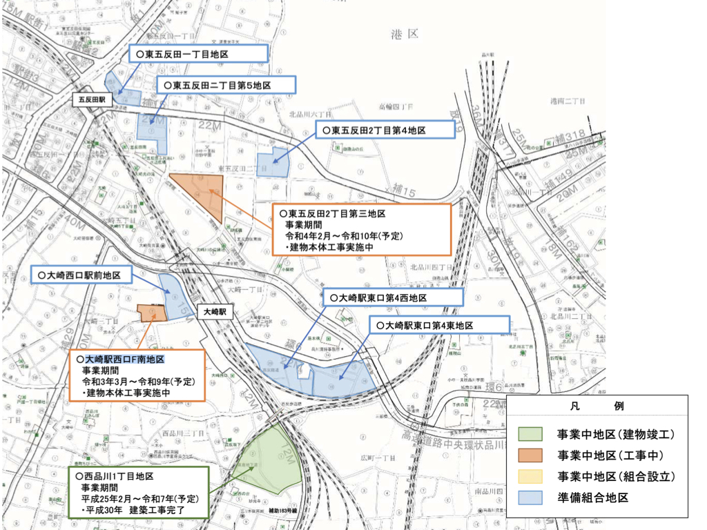 大崎駅や五反田駅周辺は、国レベルで市街地再生を推進する「都市再生緊急整備地域(都市再生特別措置法に基づくもの)」に指定されており、2002年7月指定以降、当該地域を中心に数多くの市街地再生が完了している。現在、両駅周辺エリアのうち2ヶ所で建築工事が進んでいる。