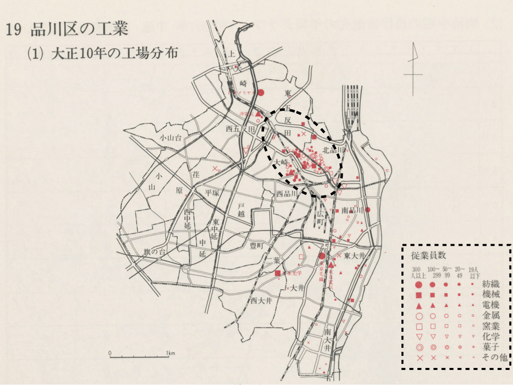 かつて、五反田駅・大崎駅周辺は工場が多い工業エリア(上図参照)であり、工業を中心に活気ある地域であった。しかし、戦後、1959年に工場等制限法が制定されたことで、大都市内部での工場建設が制限され、徐々に郊外への移転が進んでいく。その結果として工場跡地が生まれ、土地の有効利用という課題に直面した。