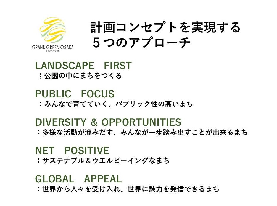 グラングリーン大阪の計画コンセプトは、「Osaka MIDORI LIFEの創造」~「みどり」と「イノベーション」の融合~。まちでの出会いが、様々な価値を創造し、社会全体を持続的に良くしていくことを目指している。