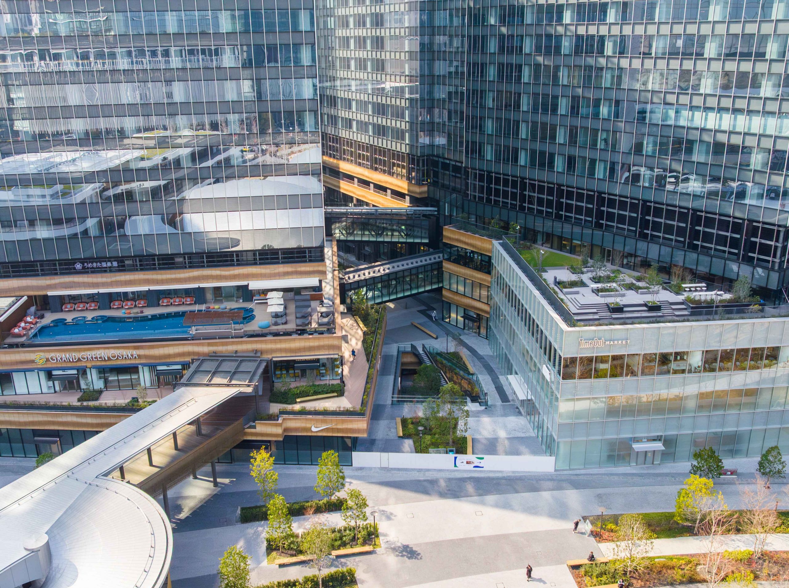 商業施設には、関西初出店の店舗を含む55のショップ&レストランが集結し、多彩なショッピングやグルメ体験が楽しめる。さらに、アジア初進出の大規模フードマーケット「タイムアウトマーケット大阪」では、7店舗と2つのバーが、関西の食文化を発信する。日本初出店となる最上級ホテル「ウォルドーフ・アストリア大阪(252室)」や「ホテル阪急グランレスパイア大阪(482室)もオープンし、都市型MICE施設「コングレスクエア グラングリーン大阪」とともに、国際的なビジネス・交流拠点としての機能が強化された。