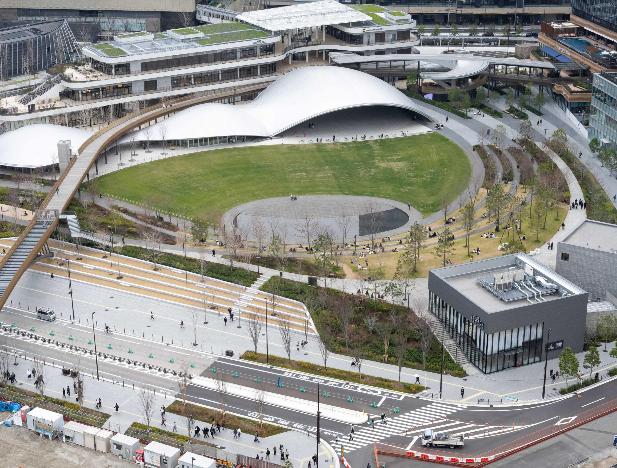 都心のオアシスのような魅力的な空間であるが、この開発の真価は、単なる公園整備にとどまらず、街全体の美観と機能を統合する点にある。(一社)うめきたMMOが公園の指定管理者として、パークマネジメントとまち全体のエリアマネジメントを一体的に進めることで、人々の交流の場としての活用が推進されている。