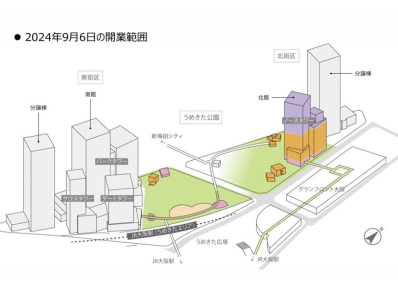 2024年9月、グラングリーン大阪の先行まちびらきは、大きな話題を呼んだ。大屋根イベントスペースを擁するサウスパークやノースパークの一部、さらに、キャノピーbyヒルトン大阪梅田や商業施設等が入居する「ノースタワー」が開業し、大阪駅前の景色が一変。西日本最大のターミナル駅、JR大阪駅前に誕生した広大な「うめきた広場」は、多くの市民や観光客に驚きをもって迎えられた。