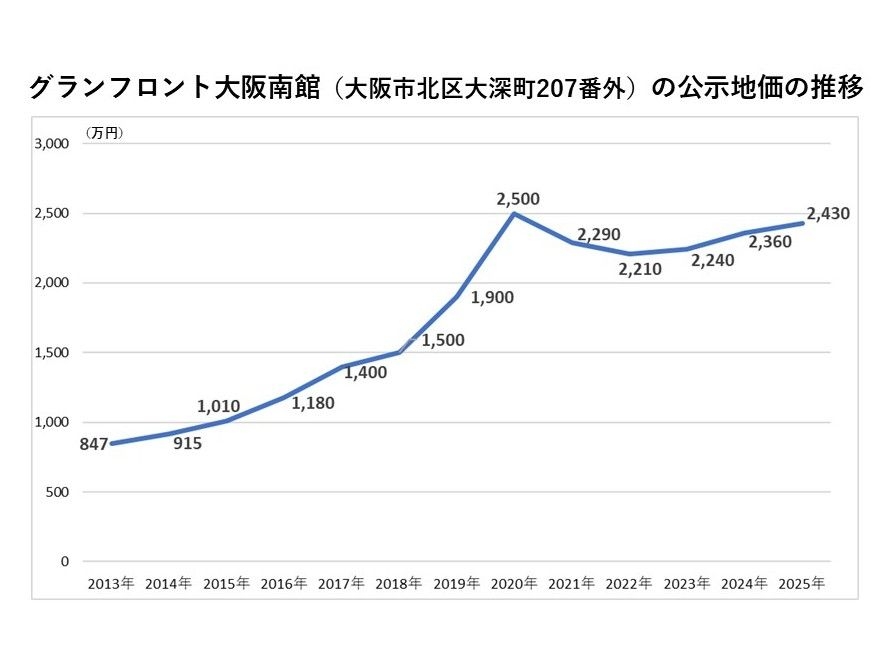 こうした背景のもと、グランフロント大阪南館の公示地価は、2013年の847万円から、2020年には2,500万円と、約3倍に上昇。関西で一番高い公示地価の場所となり、大阪駅周辺の不動産価値向上を牽引した。