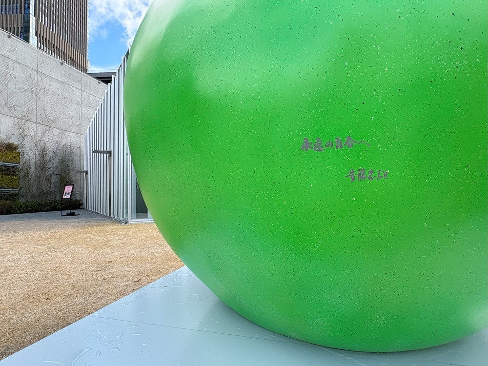 安藤氏が設計した美術館や一連の「こども本の森」には、こんな青いリンゴのオブジェが置かれている。