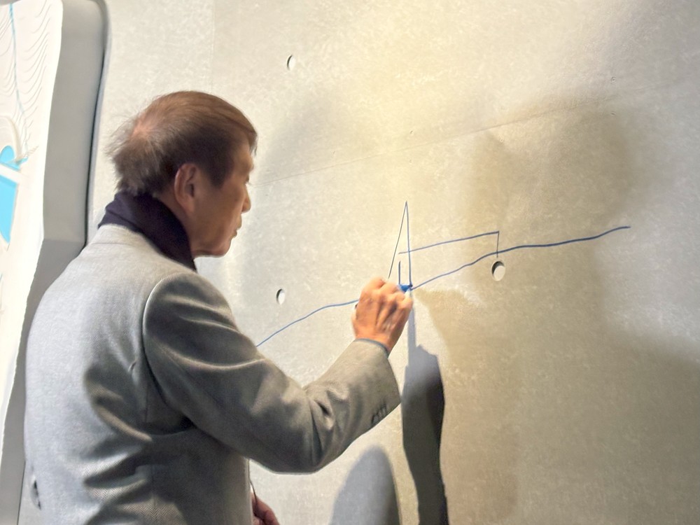 安藤氏は1941年9月生まれなので、今年84歳になり、大手術を何度か経験している。そんな人が、内覧会に来てちょっと挨拶するだけでなく、1時間立って歩いて、ときには壁にさらさらと絵を描く。信じられないエネルギーだ。