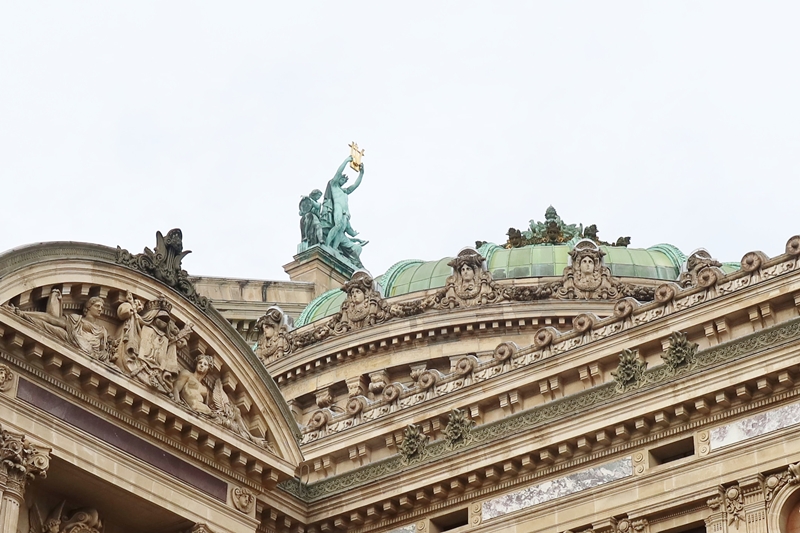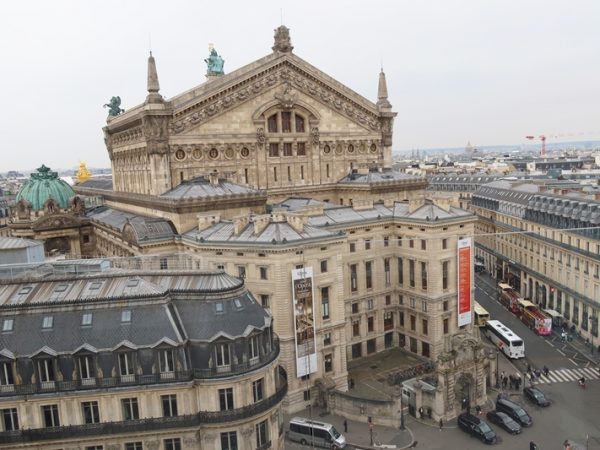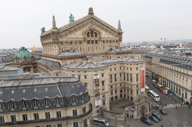 もうひとつ、ガルニエ宮を楽しむために訪れたいのは裏手にある百貨店ギャルリー・ラファイエットの屋上。ガルニエ宮とは道を隔てたところにあり、建物を上から眺めることができるのである。