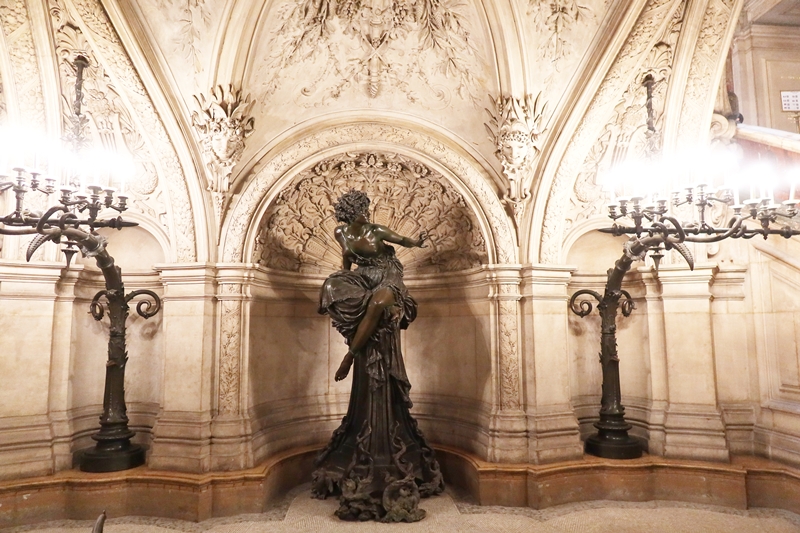 ピュティアの泉の両側にある階段を上がったところにあるのがガルニエ宮のみどころのひとつ、グラン・エスカリエ(大階段)だ。建物に入ったところから大階段までは天井が低く作られているのだが、大階段は高さが30mもの吹き抜けになっており、ここで一気に気分が高揚する。幅10mの階段の両側には2体の女性像が照明を掲げるように階段を照らしており、照度もここで一変。非日常の場に来たことを実感する。