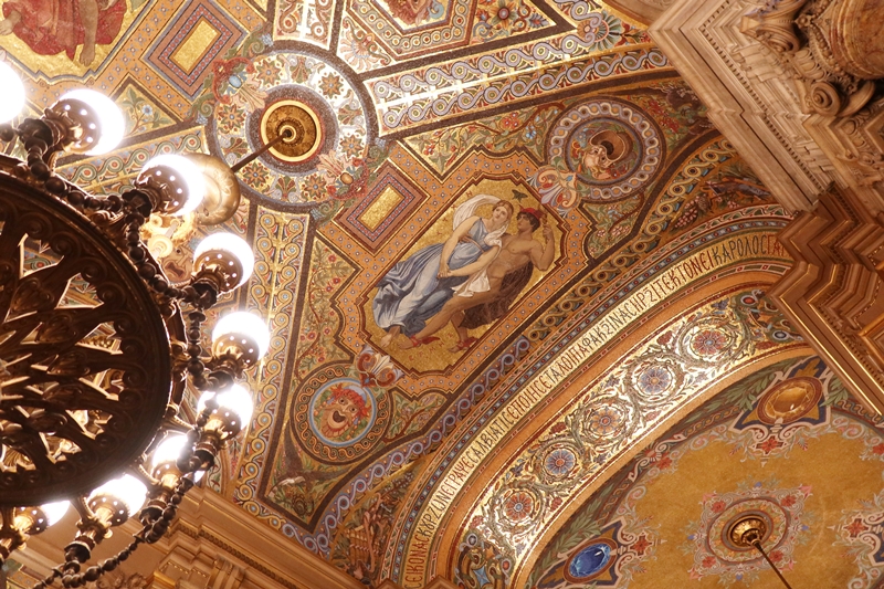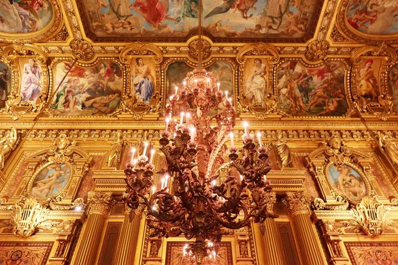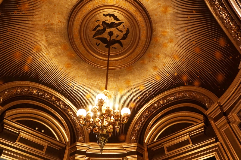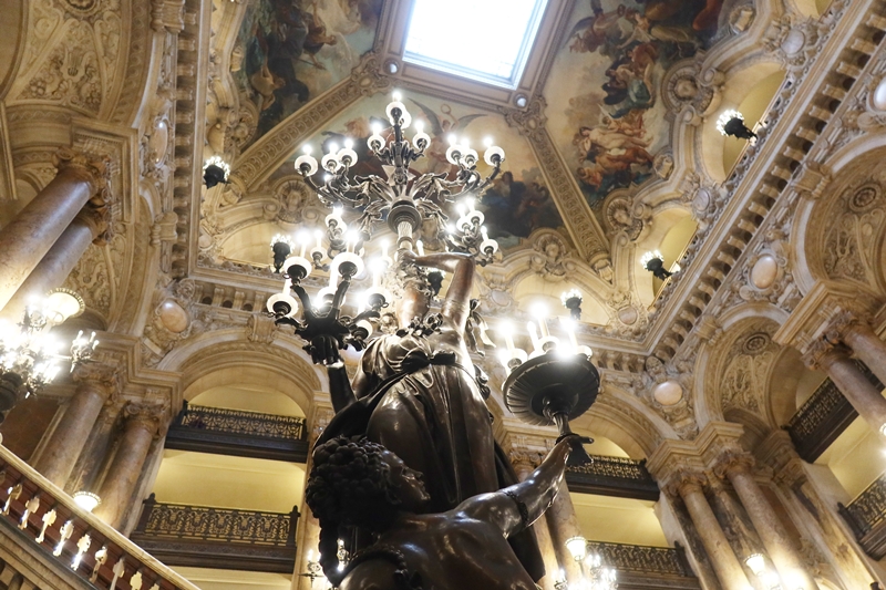大階段から見上げると天井にはアポロンを描いたフランス人画家イジドール・ピルスによる明るい絵画が飾られている。アポロンは音楽の神でもあり、その象徴は竪琴。ガルニエ宮のあちこちに竪琴のモチーフが掲げられているのはそのためだ。