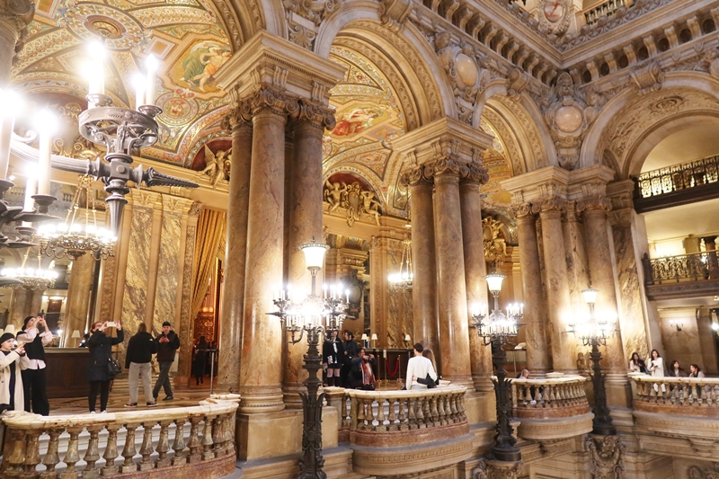 その大階段を見下ろすように小さなテラスが張り出しており、来場者はそこから天井画を見上げ、大階段を見下ろす。面白いことにその姿が小さな舞台上に立つように見え、多くの人はそこで吹き抜けを背景に自撮りをする。ガルニエがその姿を見たら、きっと自分の意図通りに使ってもらってうれしいと喜ぶのではなかろうか。ガルニエ宮は舞台の上の人だけでなく、劇場内の人も美しく見えるように作られており、自撮りしたくなる空間なのである。