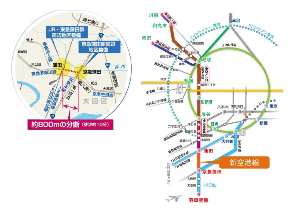 新空港線は、東急電鉄多摩川線「矢口渡駅」の近くから路線を地下化し、京浜急行電鉄「京急蒲田駅」の地下を通って「大鳥居駅」の手前で京急空港線に乗り入れる構想だ。その間にある東急電鉄「蒲田駅」と京浜急行電鉄「京急蒲田駅」は、約800m離れており、長年ミッシングリンク(分断された鉄道網)といわれてきた。